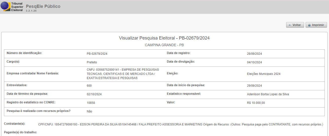 A última pesquisa* de intenção de voto que deve ser divulgada em Campina Grande será a do Instituto Exatta. Ela foi contratada pela empresa de assessoria e marketing ‘Fala Prefeito’. 600 pessoas devem ser ouvidas.