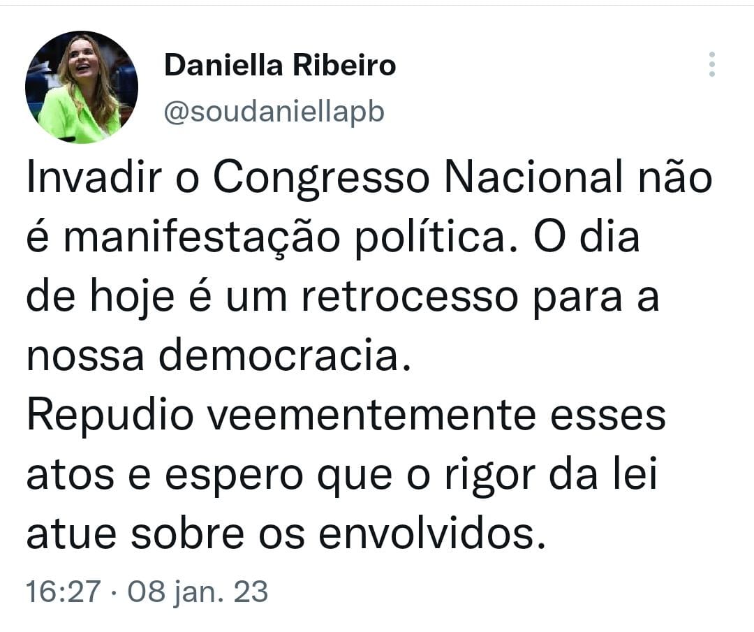 A senadora paraibana Daniella Ribeiro (PSD) classificou as invasões em Brasília neste domingo (8) como um “retrocesso para a democracia”. Conforme apurou o ClickPB, em uma publicação no Twitter, Ribeiro repudiou as ações e disse que “invadir o Congresso Nacional não é manifestação política”.