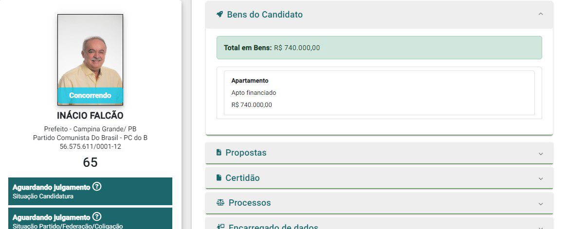 Candidato do PCdoB à Prefeitura de Campina Grande, Inácio Falcão declarou ter apenas um bem à Justiça Eleitoral. O dado foi consultado pelo ClickPB nesta terça-feira (13) no portal Divulgação de Candidaturas e Contas Eleitorais (Divulgacandcontas), do Tribunal Superior Eleitoral (TSE), que mostra dados sobre todos os candidatos de todas as eleições no Brasil.
