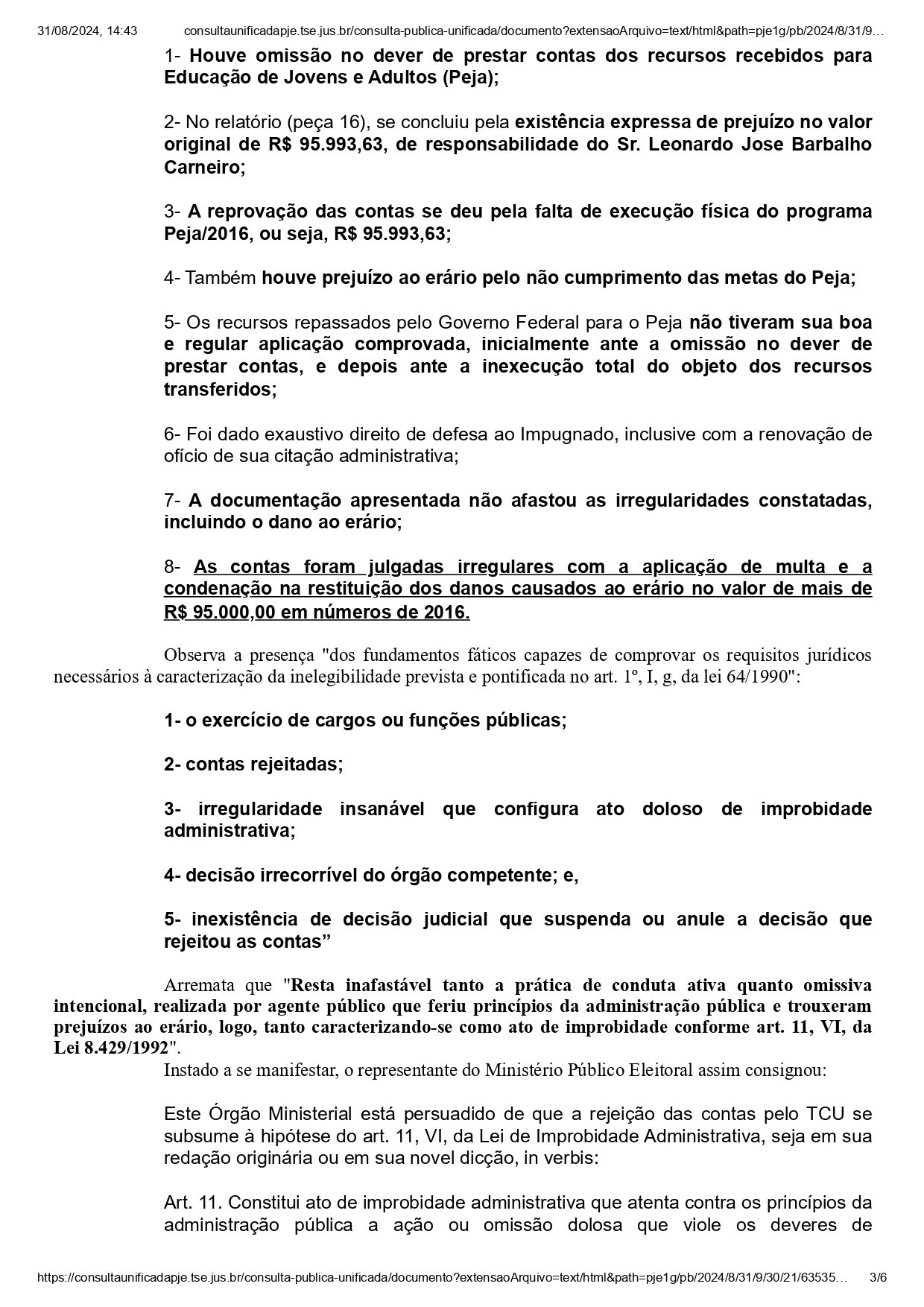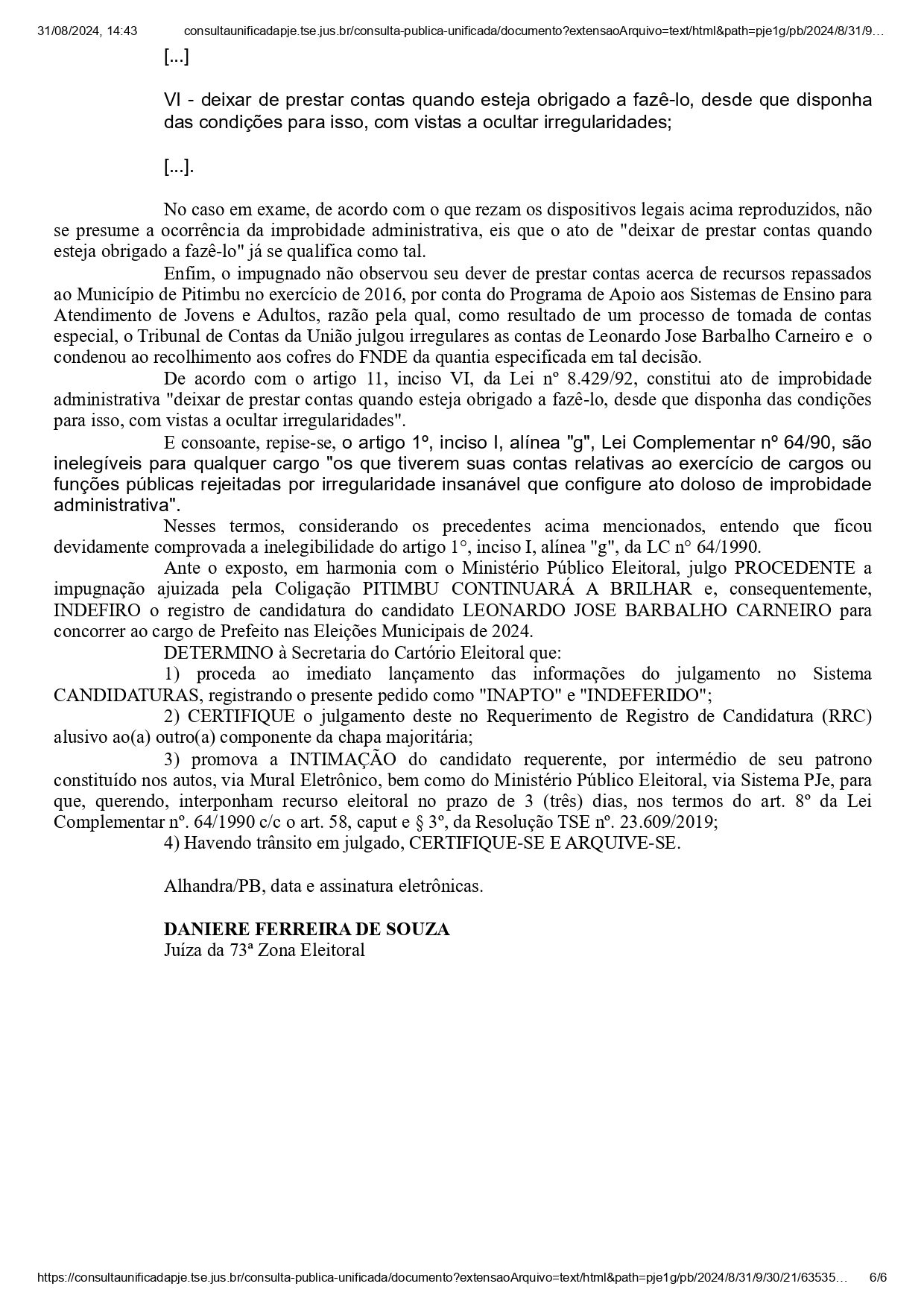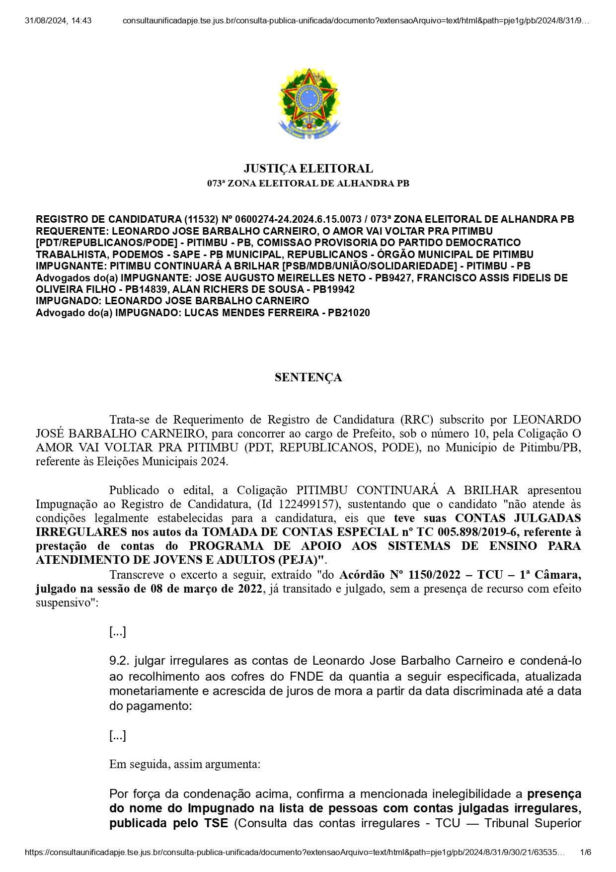 “O impugnado não observou seu dever de prestar contas acerca de recursos repassados ao Município de Pitimbu no exercício de 2016, por conta do Programa de Apoio aos Sistemas de Ensino para Atendimento de Jovens e Adultos, razão pela qual, como resultado de um processo de tomada de contas especial, o Tribunal de Contas da União julgou irregulares as contas de Leonardo Jose Barbalho Carneiro e o condenou ao recolhimento aos cofres do FNDE da quantia especificada em tal decisão. Ante o exposto, em harmonia com o Ministério Público Eleitoral, julgo procedente a impugnação ajuizada pela Coligação Pitimbu Continuará a Brilhar e, consequentemente, indefiro o registro de candidatura do candidato Leonardo José barbalho Carneiro para concorrer ao cargo de Prefeito nas Eleições Municipais de 2024”, argumentou a juíza, como notado pelo ClickPB.