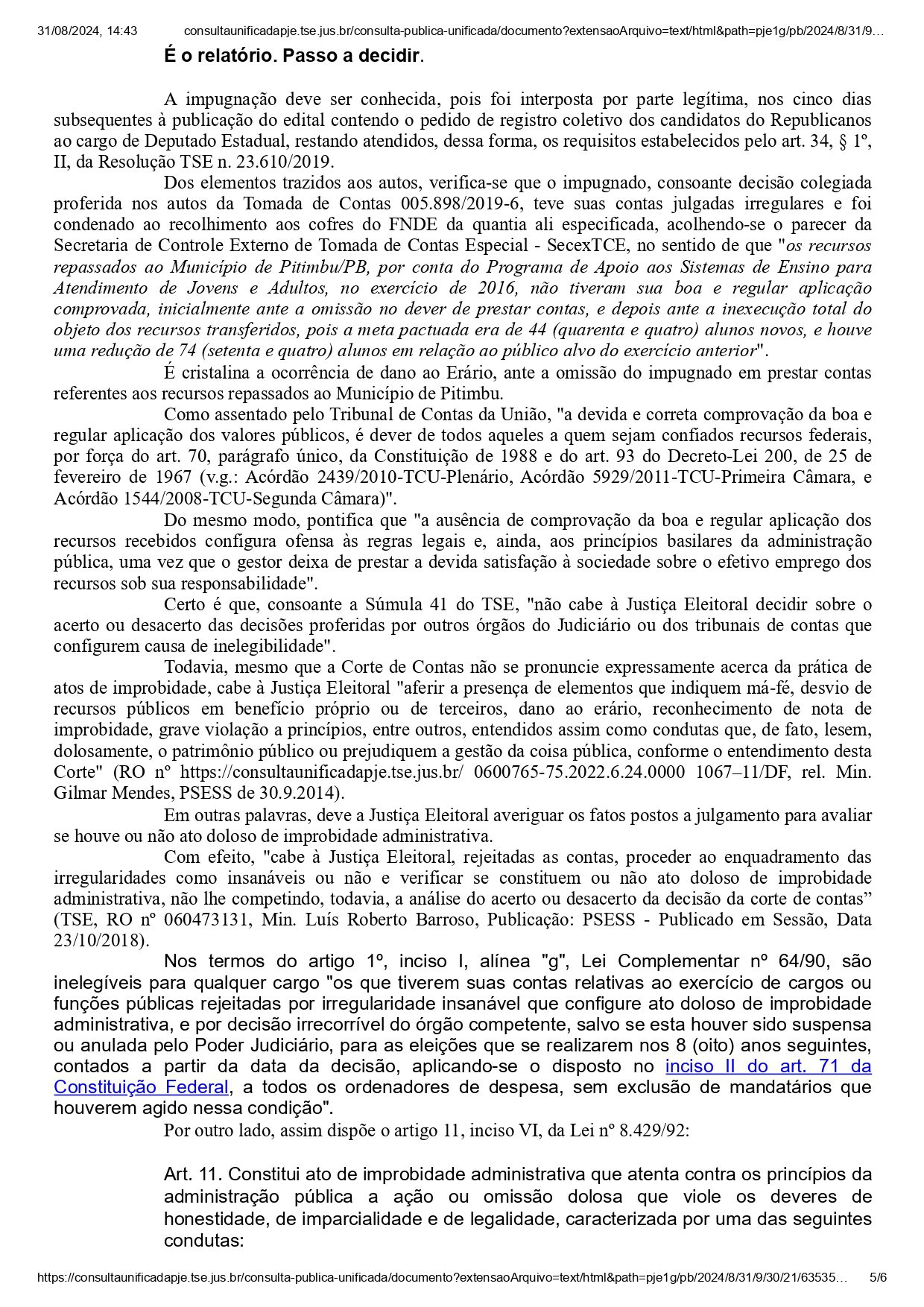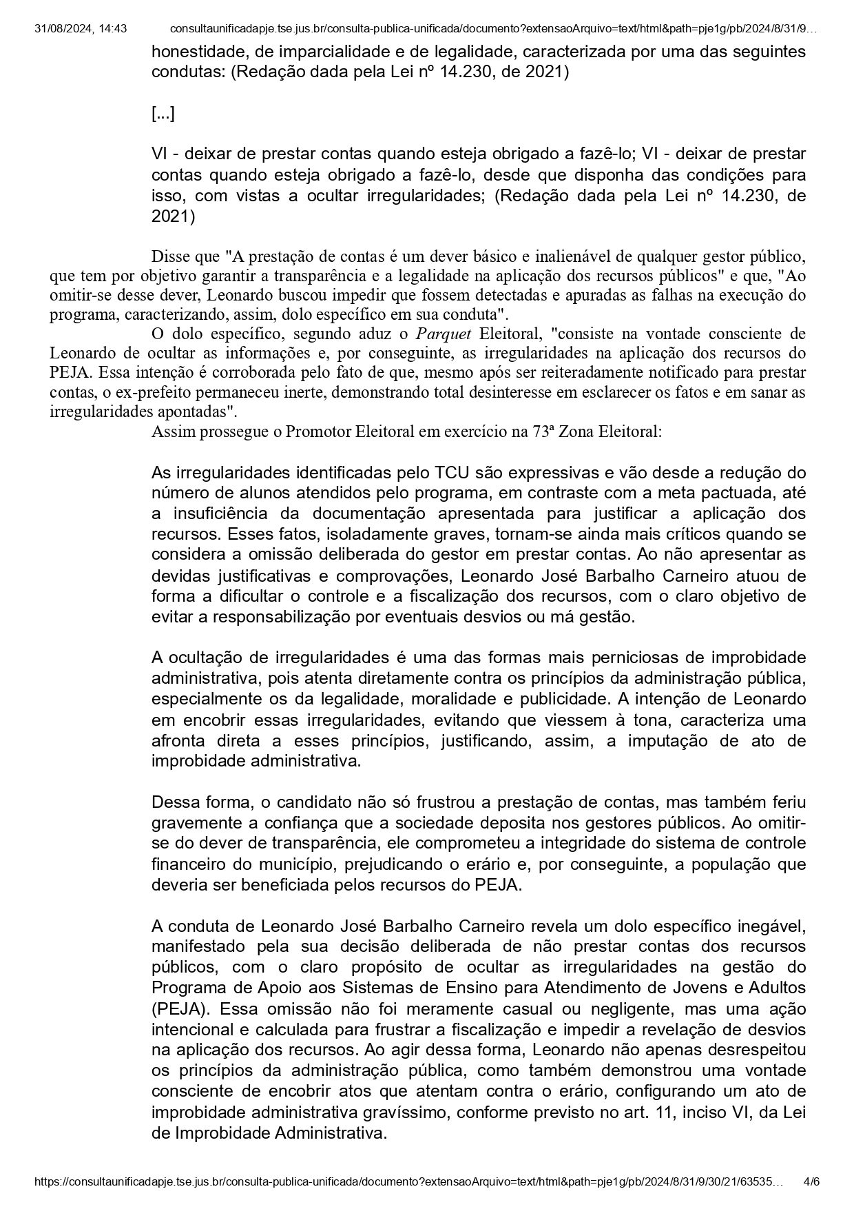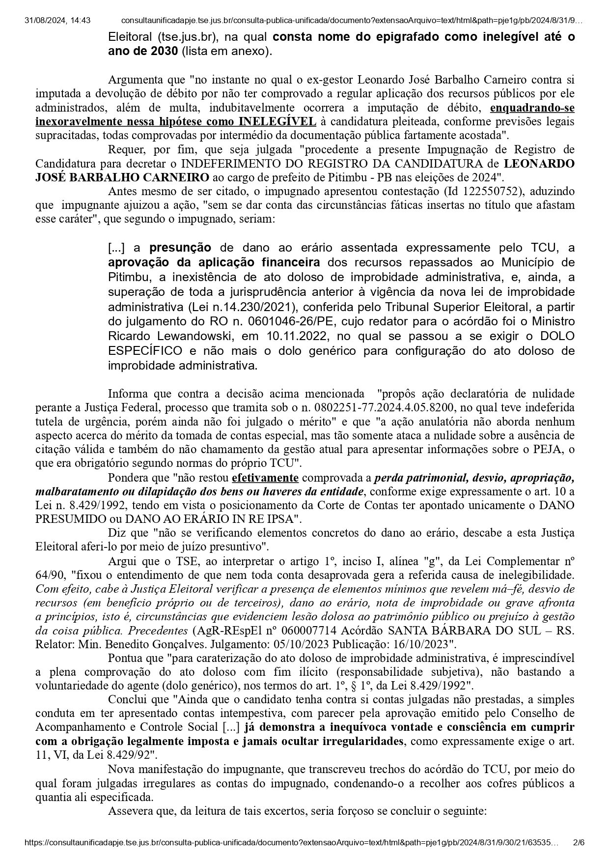 “O impugnado não observou seu dever de prestar contas acerca de recursos repassados ao Município de Pitimbu no exercício de 2016, por conta do Programa de Apoio aos Sistemas de Ensino para Atendimento de Jovens e Adultos, razão pela qual, como resultado de um processo de tomada de contas especial, o Tribunal de Contas da União julgou irregulares as contas de Leonardo Jose Barbalho Carneiro e o condenou ao recolhimento aos cofres do FNDE da quantia especificada em tal decisão. Ante o exposto, em harmonia com o Ministério Público Eleitoral, julgo procedente a impugnação ajuizada pela Coligação Pitimbu Continuará a Brilhar e, consequentemente, indefiro o registro de candidatura do candidato Leonardo José barbalho Carneiro para concorrer ao cargo de Prefeito nas Eleições Municipais de 2024”, argumentou a juíza, como notado pelo ClickPB.