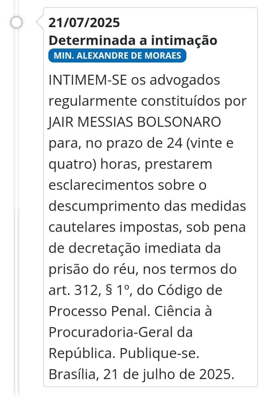 Conforme observou o ClickPB, no andamento do processo eletrônico, os advogados de Bolsonaro tem 24 horas para explicarem descumprimento da medida cautelar que proíbe a utilização de redes sociais pelo ex-presidente ou por intermédio de terceiros, imposta no dia 17 de julho.