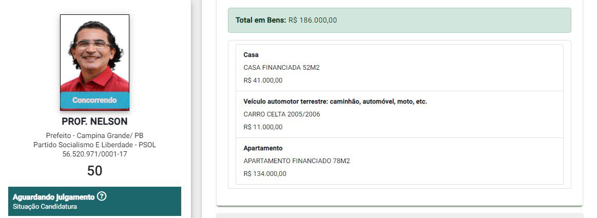 O professor Nelson Júnior, candidato do PSOL a prefeito de Campina Grande, declarou à Justiça Eleitoral ter R$ 186 mil em bens. Os dados foram consultados pelo ClickPB nesta terça-feira (13) no portal Divulgação de Candidaturas e Contas Eleitorais (Divulgacandcontas), do Tribunal Superior Eleitoral (TSE), que mostra dados sobre todos os candidatos de todas as eleições no Brasil.