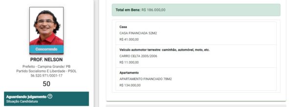 O professor Nelson Júnior, candidato do PSOL, declarou à Justiça Eleitoral ter R$ 186 mil em bens. Na lista constam: uma casa financiada no valor de R$ 41 mil; um apartamento financiado avaliado em R$ 134 mil; e um celta 2005/2006 no valor de R$ 11 mil.