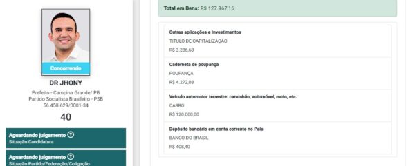 Jhony Bezerra (PSB) declarou à Justiça Eleitoral ter R$ 127.967,16 em bens. Como visto pelo ClickPB, Jhony declarou ter um veículo no valor de R$ 120 mil; R$ 4.272,08 em poupança; R$ 3.286,68 em título de capitalização; e R$ 408,40 em depósito bancário.